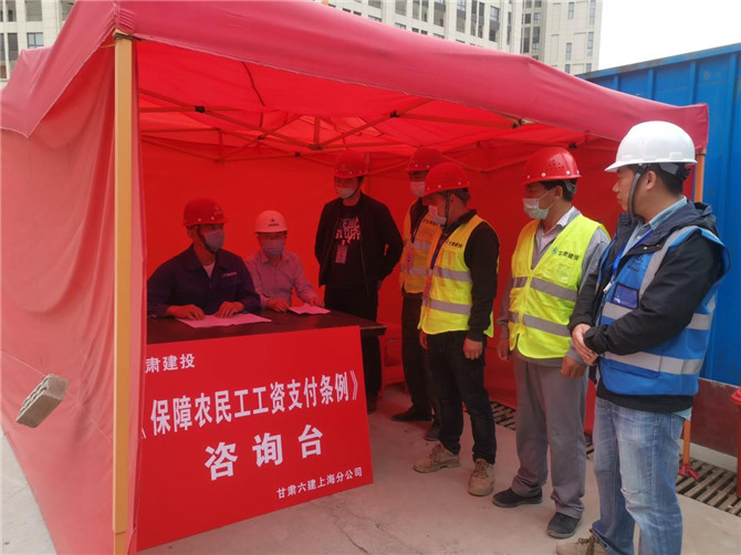 為確?!侗U限r(nóng)民工工資支付條例》宣傳貫徹到位,維護農(nóng)名工合法權(quán)益和社會和諧穩(wěn)定,5月1日至5月5日,甘建投(上海)房地產(chǎn)有限公司與施工總包單位甘肅六建一同開展《保障農(nóng)民工工資支付條例》學(xué)習(xí)宣傳活動。