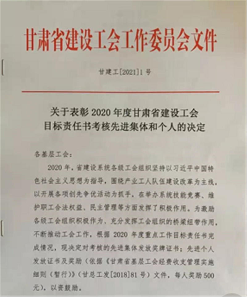 近日,置業(yè)公司工會(huì)在甘肅省建設(shè)工會(huì)委員組織的2020年度甘肅省建設(shè)工會(huì)目標(biāo)責(zé)任書考核中評(píng)為“2020年度目標(biāo)責(zé)任書考核先進(jìn)集體”。