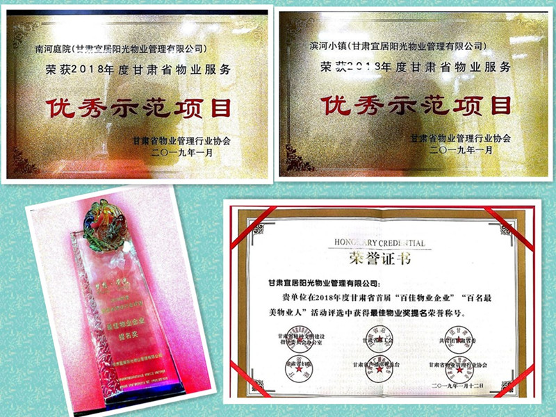 1月12日, 在甘肅省首屆“百家物業(yè)企業(yè)”、“百名最美物業(yè)人”評選活動頒獎晚會中,置業(yè)公司旗下的宜居陽光物業(yè)管理有限公司榮獲“最佳物業(yè)企業(yè)提名獎”,南河庭院項目主任金蘭榮獲甘肅物業(yè)行業(yè)貢獻(xiàn)獎。同日在首屆甘肅省省優(yōu)示范項目評定中由宜居陽光物業(yè)管理的南河庭院物業(yè)項目、濱河小鎮(zhèn)物業(yè)項目均獲得“甘肅省物業(yè)服務(wù)優(yōu)秀示范項目”的榮譽稱號。